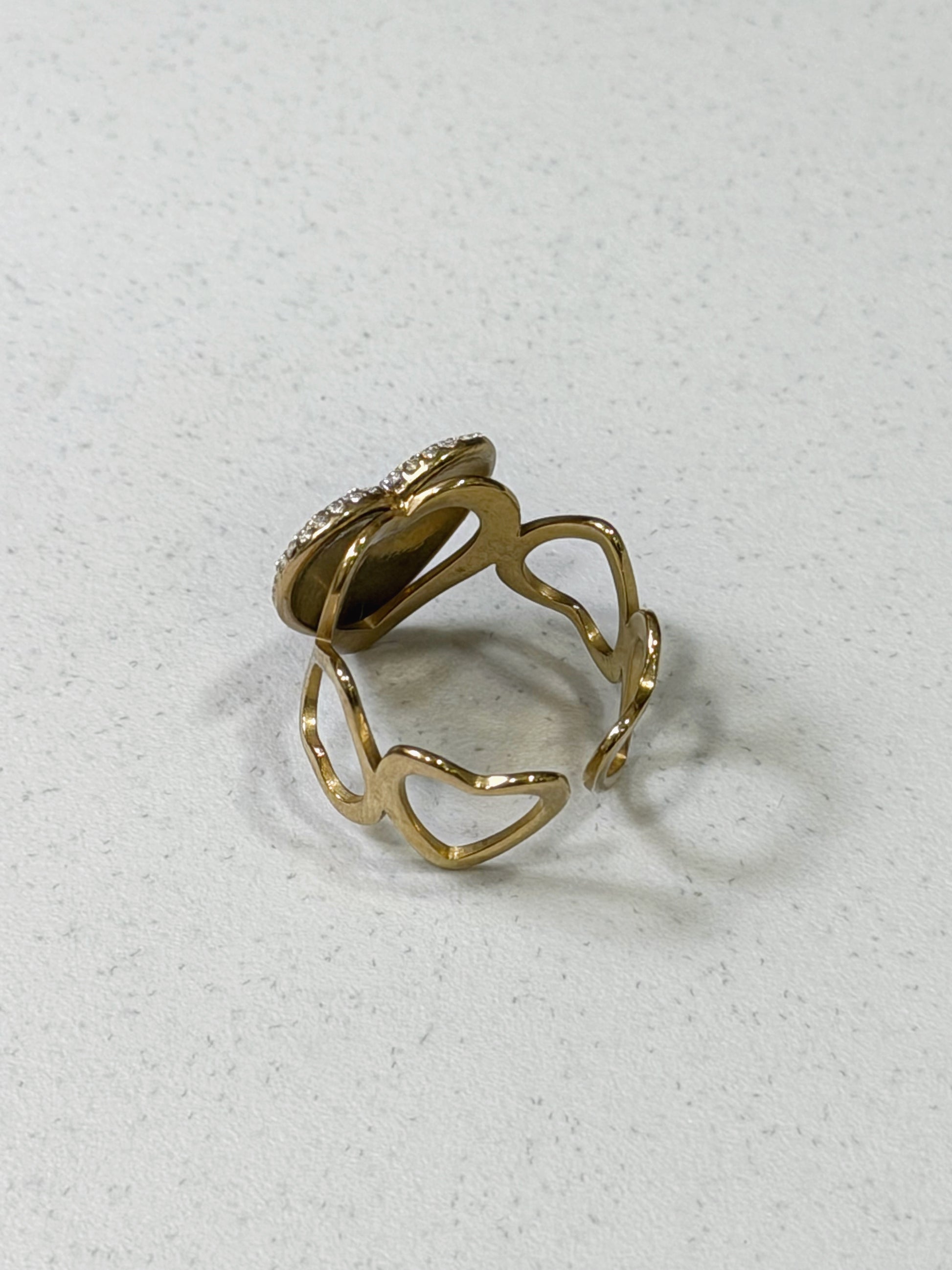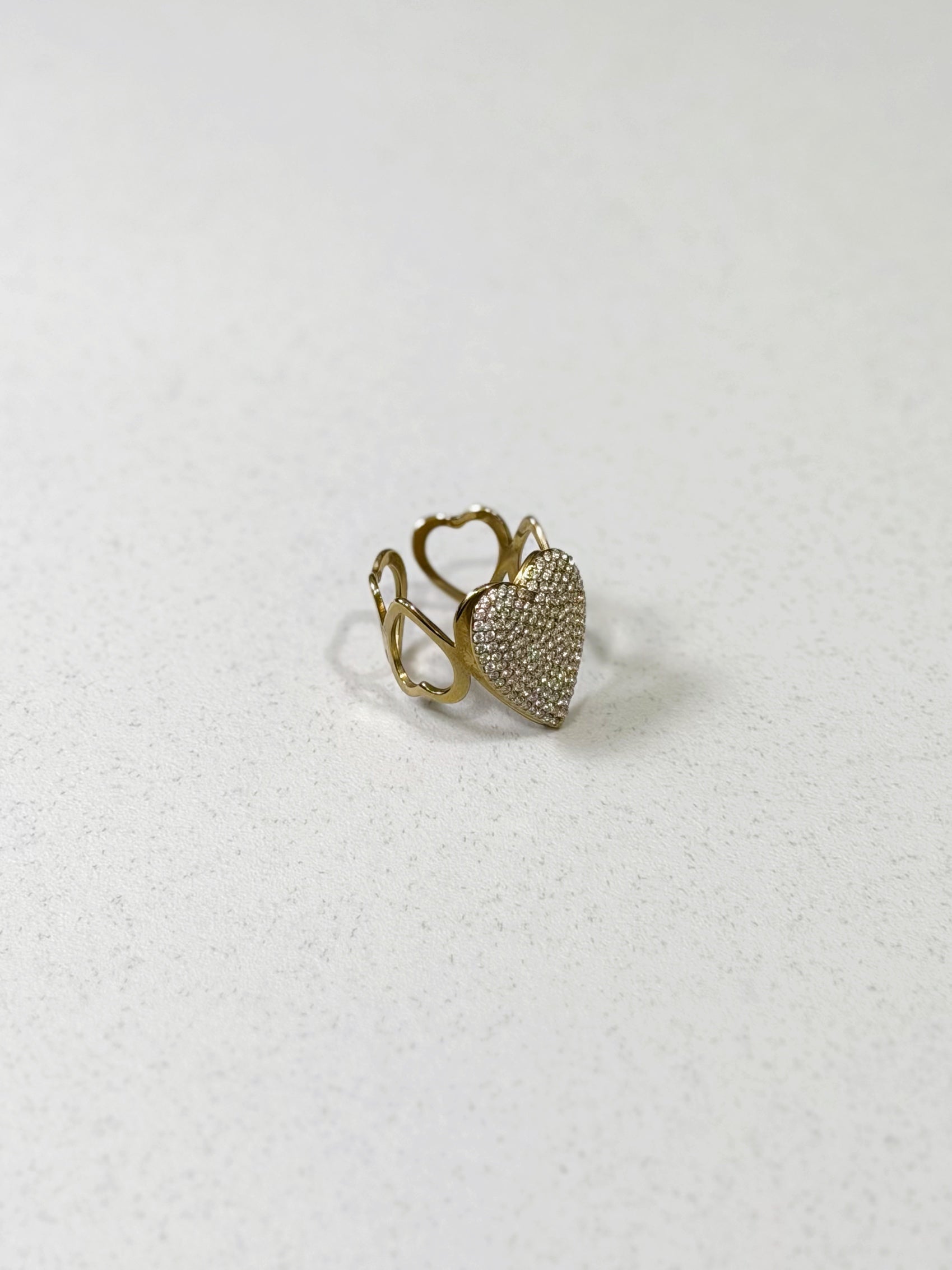 Anello dal design romantico e sofisticato, caratterizzato da un cuore centrale impreziosito da un pavé luminoso che cattura la luce con ogni movimento. La struttura dorata, con linee fluide e avvolgenti, dona equilibrio tra eleganza e modernità, valorizzando il gioiello con un tocco raffinato ma deciso. Un anello simbolo di amore e luce, pensato per chi desidera distinguersi con classe.