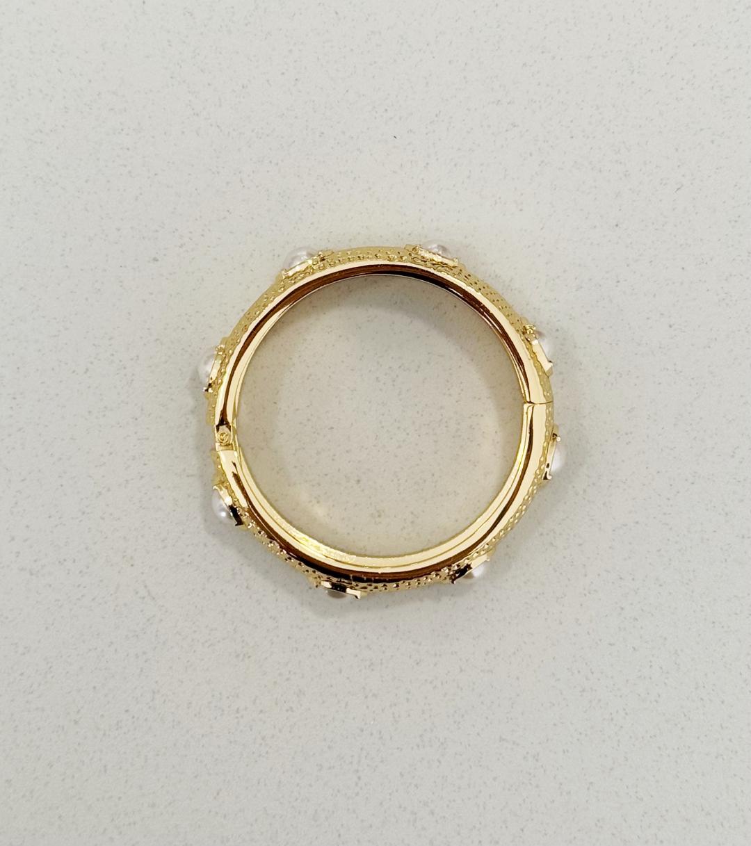 Bracciale rigido dorato con perle bianche incastonate e superficie martellata.