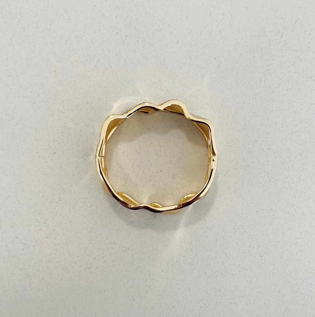 Bracciale rigido dorato con finitura lucida e silhouette ondulata ispirata al movimento del mare. Un accessorio elegante e moderno, ideale per aggiungere un tocco di stile deciso e raffinato a ogni look.