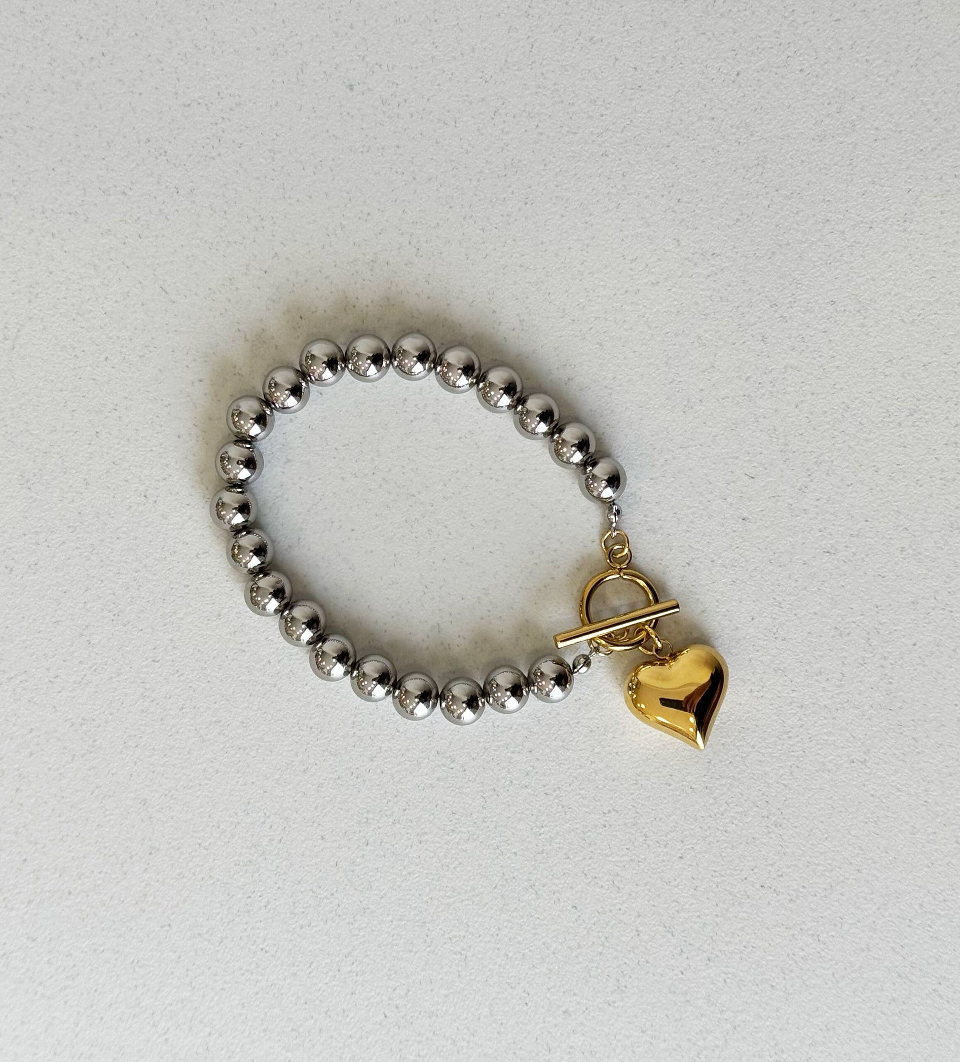 Bracciale bicolore, con eleganti sfere argentate, chiusura a T e ciondolo gold a Cuore Bombato.