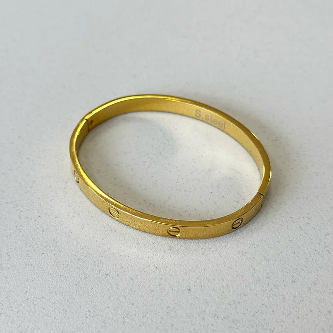 Bracciale rigido in acciaio inox, finitura gold o silver. Il bracciale è caratterizzato da un design pulito e minimalista e impreziosito da un motivo a viti inciso, che aggiunge un dettaglio raffinato e distintivo.