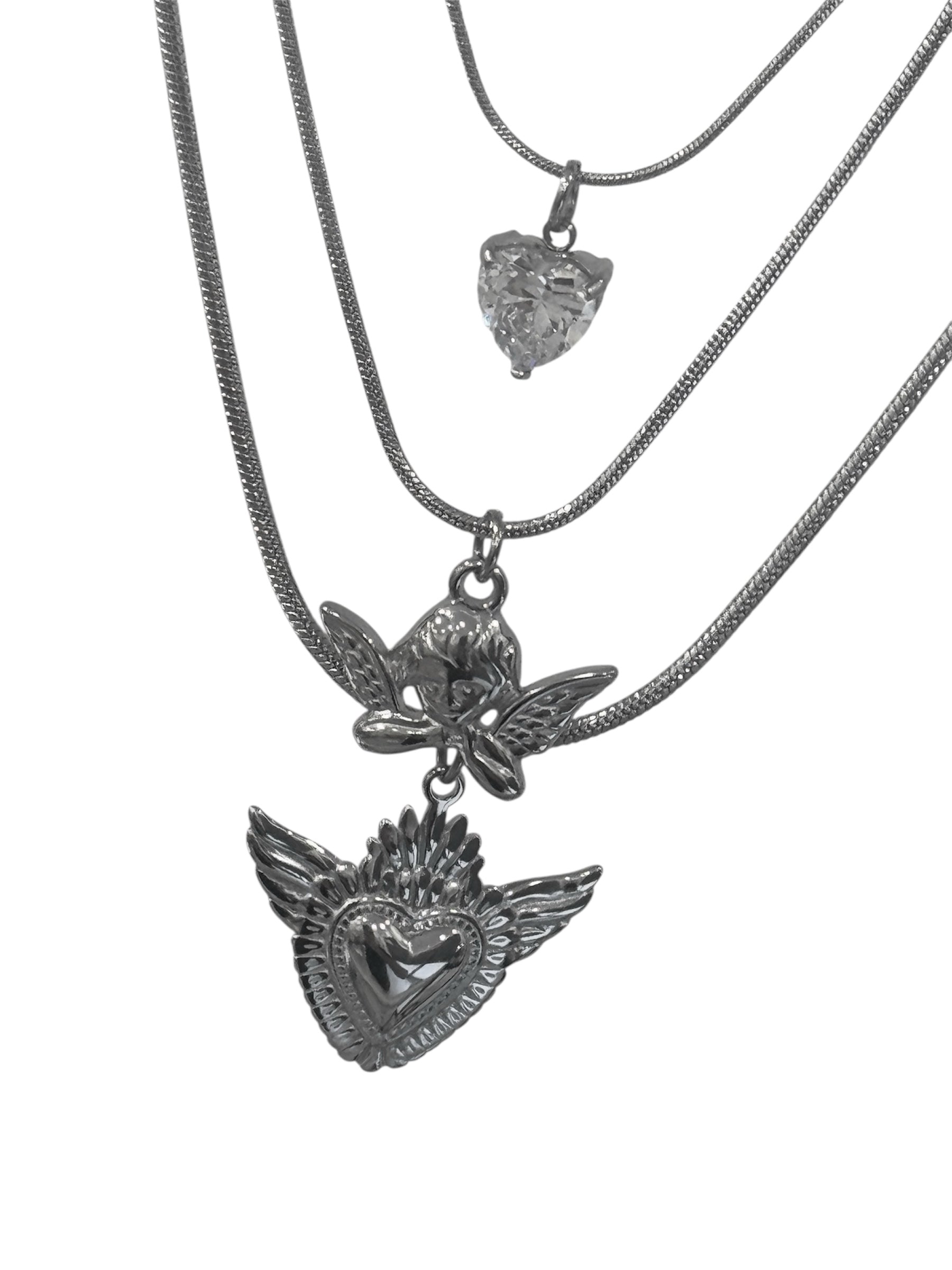 Collana unica 3 fili con ciondoli: Sacro Cuore, Angelo, cuore zircone.