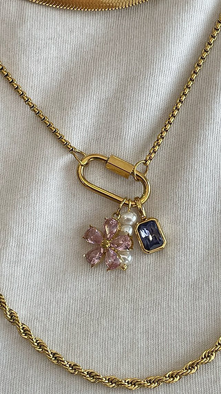 La collana Flora è un omaggio alla bellezza naturale e alla grazia femminile. Caratterizzata da tre ciondoli: fiore rosa, pietra viola e perle delicate.