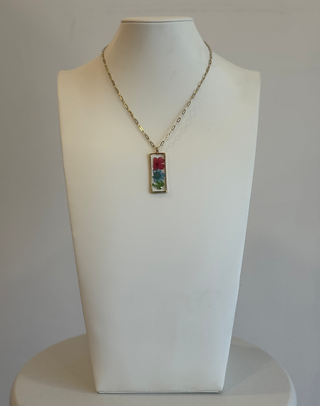 Ispirata alla bellezza dei fiori, la collana Flowers è un inno alla femminilità e alla leggerezza. Ha un ciondolo rettangolare con tre fiori: rosa, azzurro, verde, in uno strato di resina.