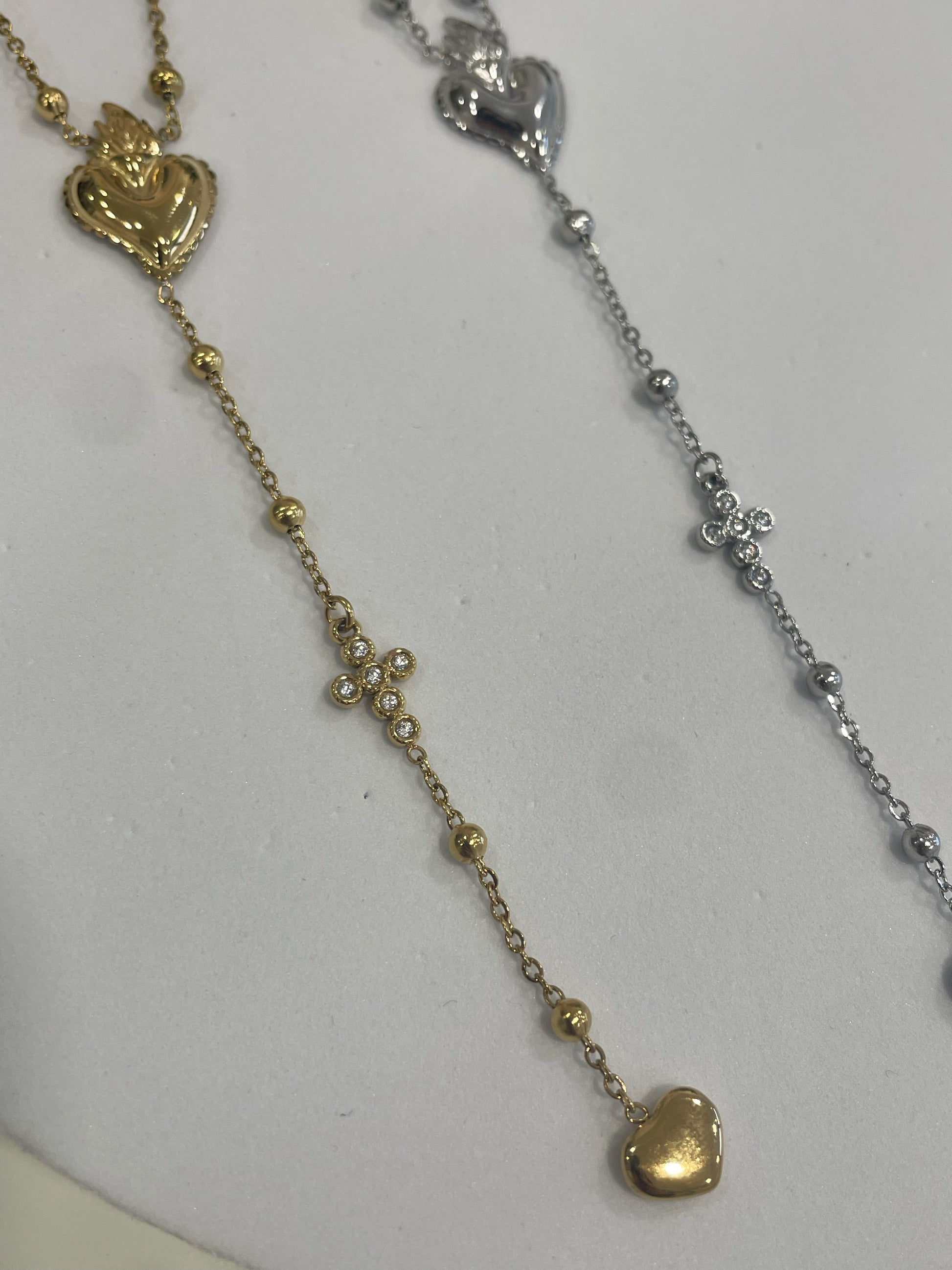 La collana lunga Cuore Sacro è un gioiello elegante e simbolico che unisce stile e significato. Realizzata in acciaio inox, presenta un cuore fiammeggiante centrale e una croce decorativa che dona un tocco raffinato e spirituale.