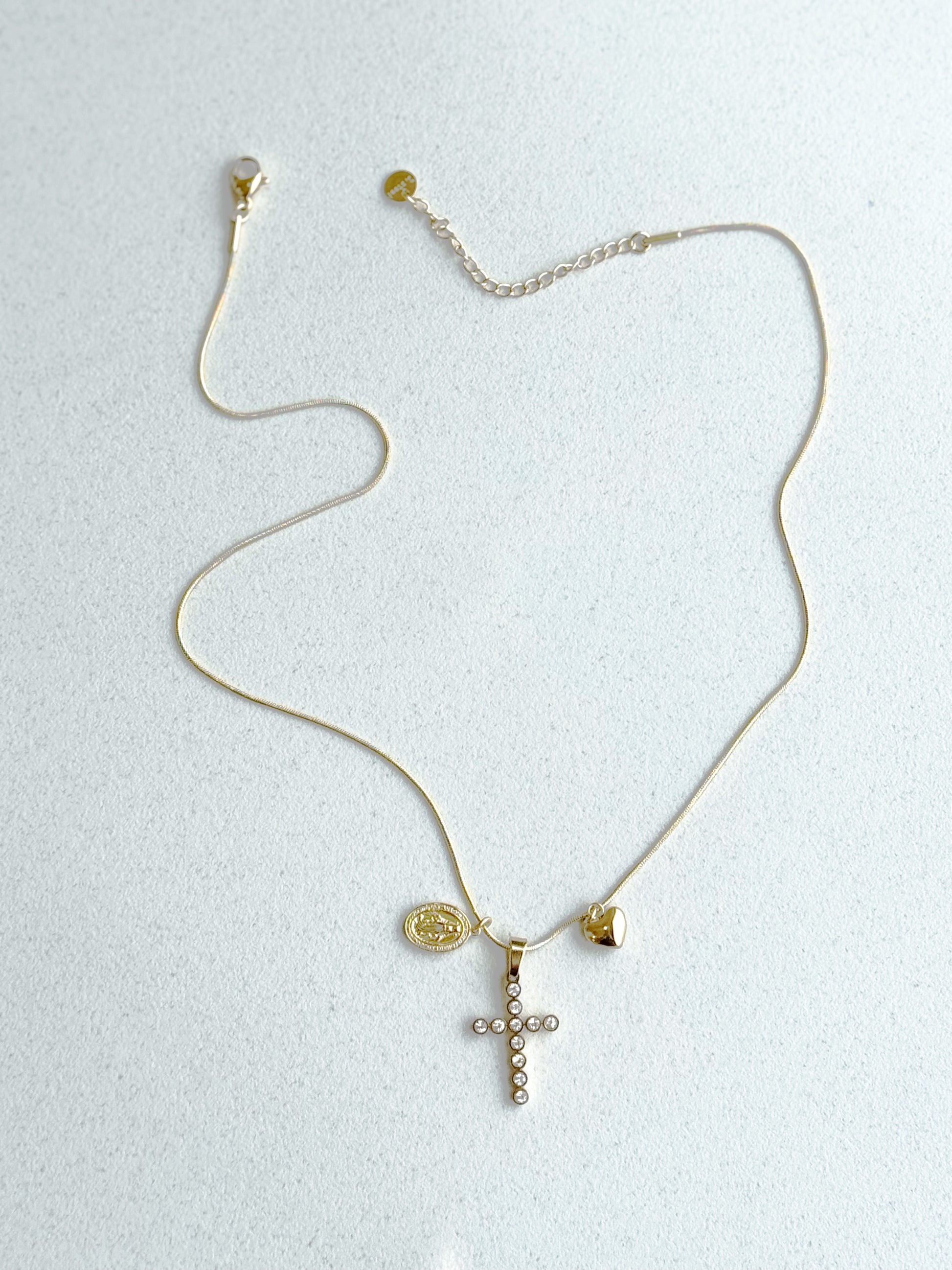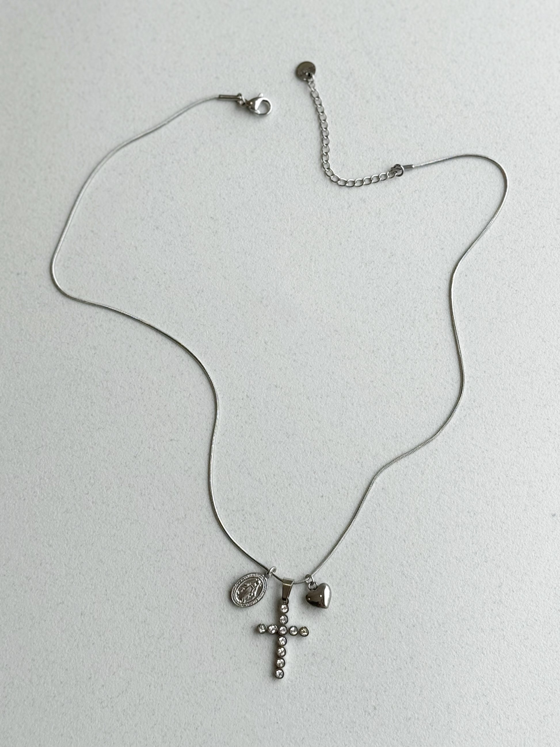 Collana simbolica ed elegante, arricchita da tre ciondoli: una croce luminosa con strass incastonati, una medaglietta religiosa incisa e un piccolo cuore lucido.