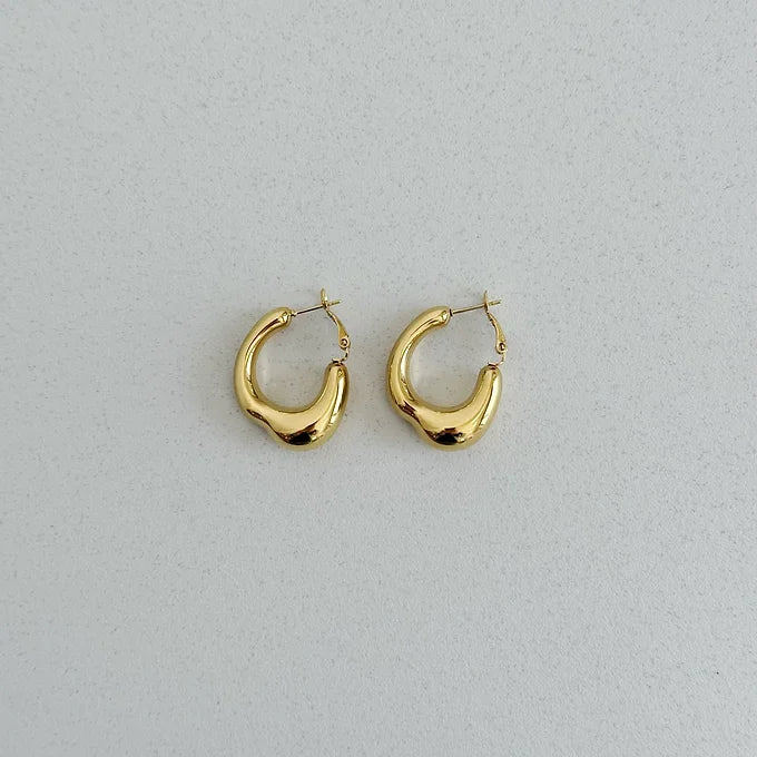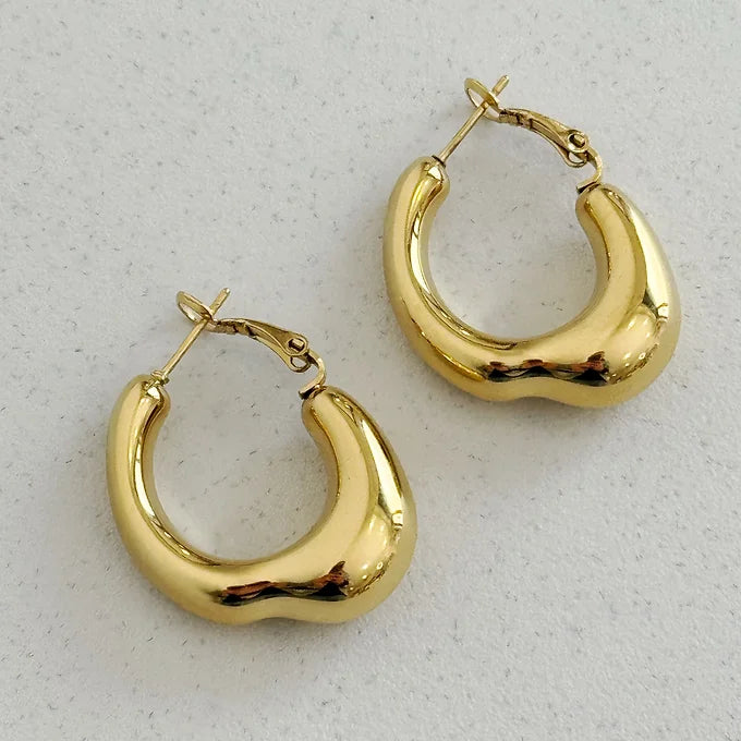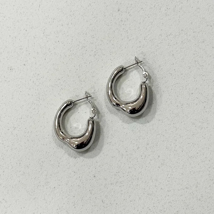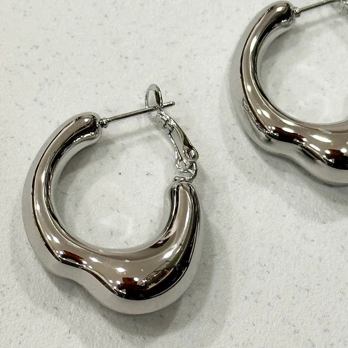 Orecchini a cerchio dal design sinuoso e riflessi luminosi che catturano la luce da ogni angolazione.